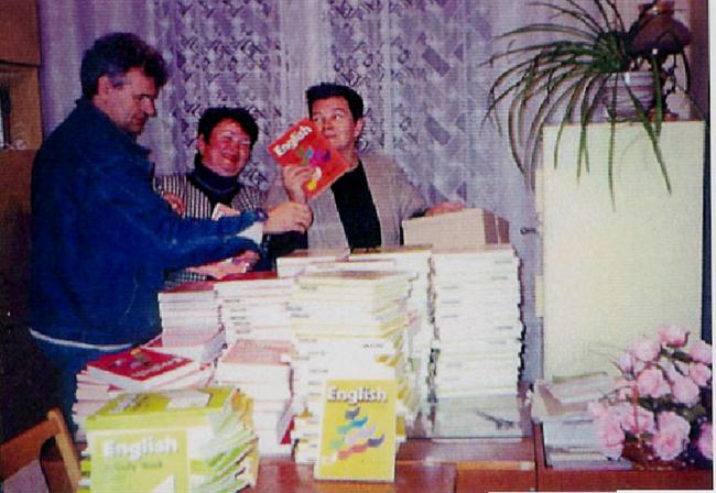 Giften van sponsoren maken het mogelijk Engels – Russische taalboeken en sportartikelen voor alle scholen in Bychov aan te schaffen.